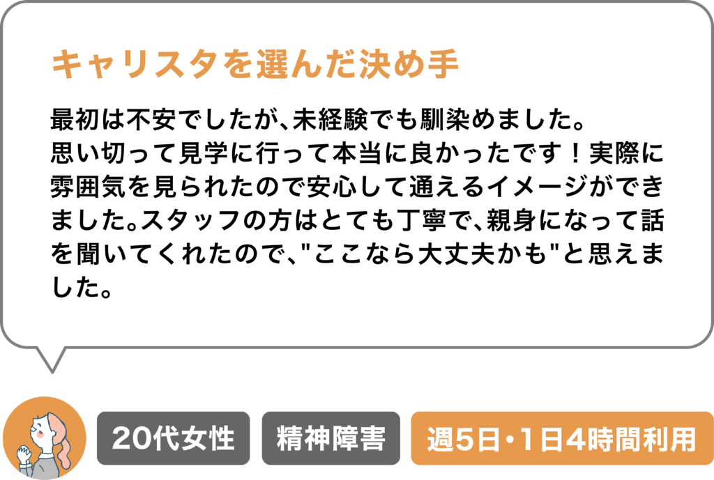 キャリスタでは「働きづらさ」「生きづらさ」を抱えている方が「自分らしく働ける」ように就職サポートをおこなっています。