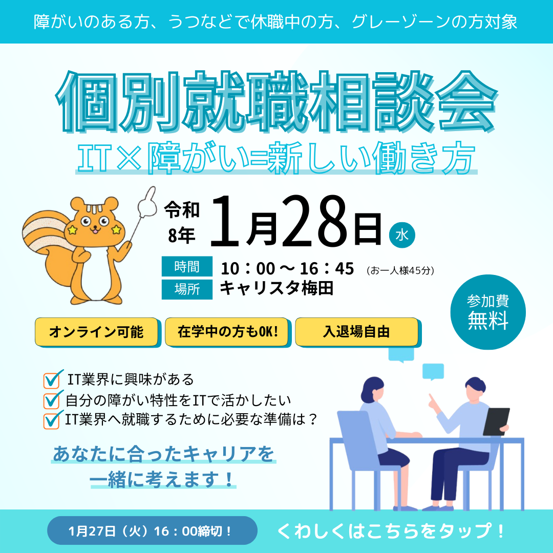 キャリスタ梅田では、障がいをお持ちの方や休職中の方、グレーゾーンの方に向けて、個別の就職相談を行っています。